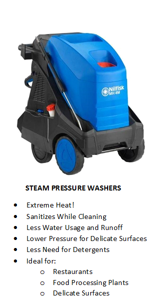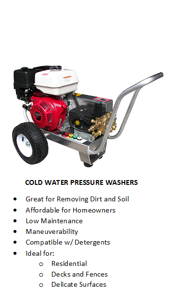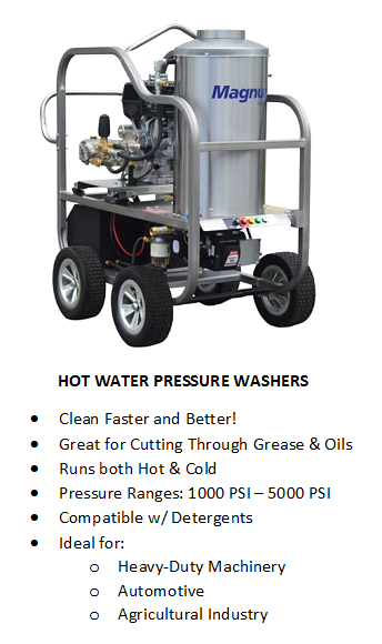 Your best bet for choosing the type of pressure washer to meet your needs, is to come into our shop and have one of our experienced employees help you decide what’s best for your line of work. Here’s something to think about on your way here: are you washing away oils or grease? Anytime oils or grease are involved—such as with foods or large flat surfaces—you should be using a hot water pressure washer.