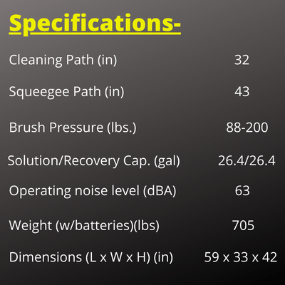 Components such as the scrub deck and squeegee are made of durable aluminum which affords the user longer life in tough applications